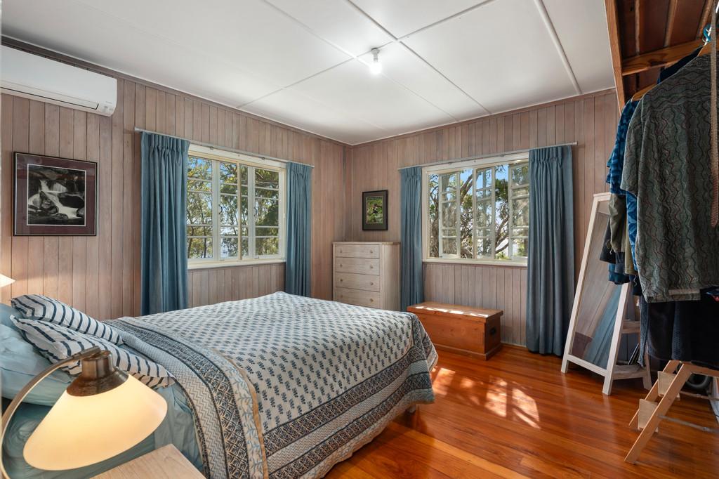 Inside, the home retains its classic Queenslander appeal with high ceilings, VJ panelling, casement windows and polished timber floors throughout. The open-plan kitchen features original timber cabinetry along with an electric cooktop and oven, flowing seamlessly through the dining area and into the spacious lounge. Here, expansive lake views take centre stage and extend directly onto the front balcony, creating a beautiful indoor-outdoor connection. Two generous bedrooms are serviced by a well-kept bathroom, while a separate toilet adds convenience. Comfort is assured year-round with split system air conditioning throughout. At the rear, a large covered deck provides a private retreat - ideal for entertaining, unwinding or simply immersing yourself in the surrounding natural beauty. An additional versatile space at the rear offers endless possibilities, whether as a rumpus room, art studio, home office, or hobby room.