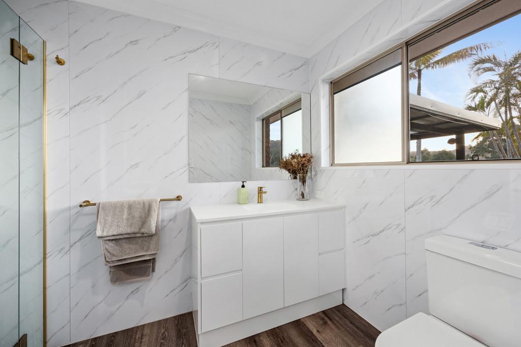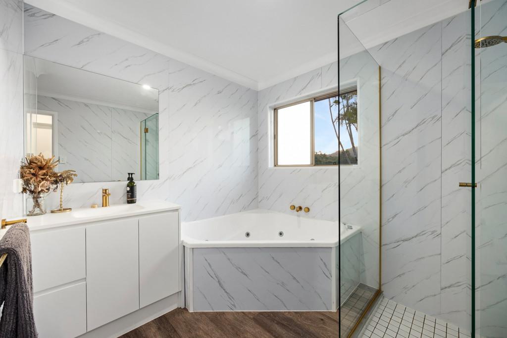 The main bedroom suite features a mirrored robe and ensuite, and both bathrooms boast elegant marble-look wall panelling - the main with corner spa bath. There are ceiling fans throughout, and covered parking for five vehicles completes the picture.