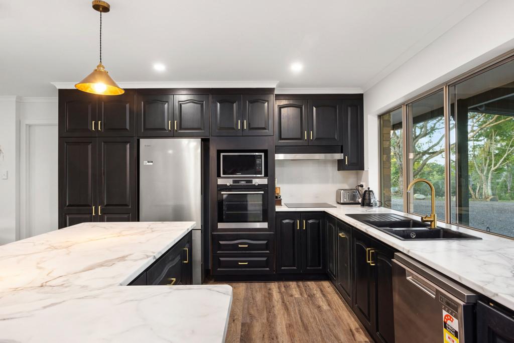 The beautifully renovated main residence has a versatile floor plan centred around an open plan living area complete with cosy fireplace. A striking contemporary kitchen takes centre stage, with sleek black cabinetry, laminate bench-tops , dishwasher, and island bench with breakfast bar. This area opens onto covered patios on both sides, giving you a choice of spots to relax and soak up the fresh air. A second living area means you can entertain guests while the kids are occupied.