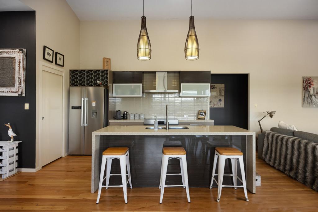 The upper level is dedicated to open plan living and dining, where raked ceilings enhance volume and natural light, and glass sliding doors open to an expansive, private entertaining deck oriented toward the mountain backdrop. The kitchen is finished with stone benchtops, electric cooking and a walk-in pantry, positioned to support both daily living and larger gatherings with ease.