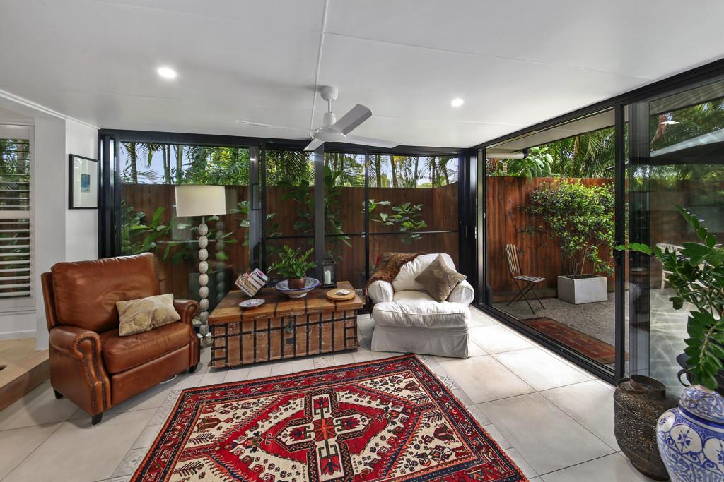 A wide entrance welcomes you with soft natural light and a sense of space that unfolds beautifully throughout the home. The open-plan living area forms the heart of the residence, complemented by a formal lounge and adjoining sunroom - inviting spaces where clean lines, tiled floors, and plantation shutters blend modern comfort with timeless design, all while framing private views over the lush tropical gardens.