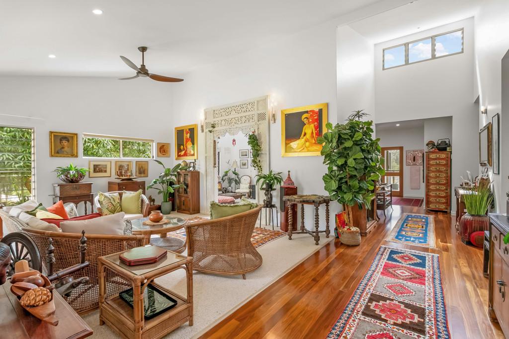 From the moment you arrive, the home makes an unforgettable impression. A wide, grand entry welcomes you inside, where soaring high ceilings, rich solid timber flooring, and an abundance of natural light create a sense of warmth and timeless character. Designed to embrace its picturesque surroundings, the home is filled with expansive windows and louvres, inviting cooling breezes and seamlessly blending indoor and outdoor living.