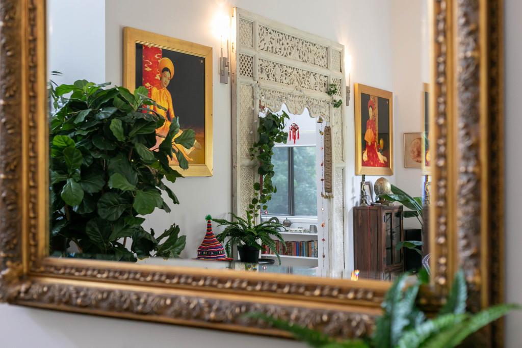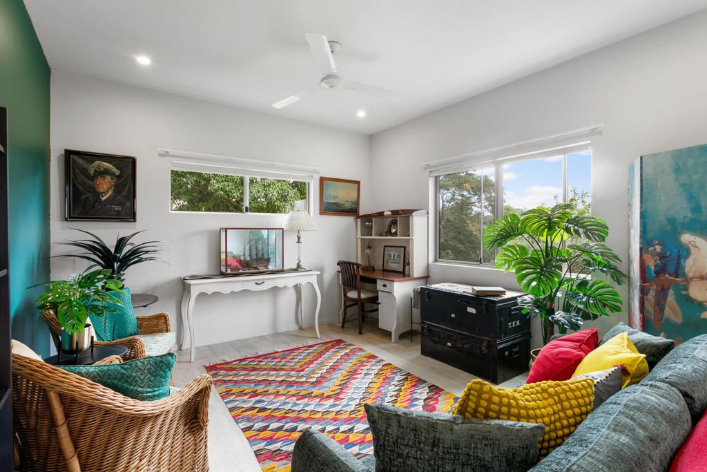 The formal living area is both spacious and inviting, framed by greenery from every angle. Through a striking timber feature doorway, this space flows effortlessly into a charming piano room or optional fifth bedroom, offering flexibility for growing families or guests.