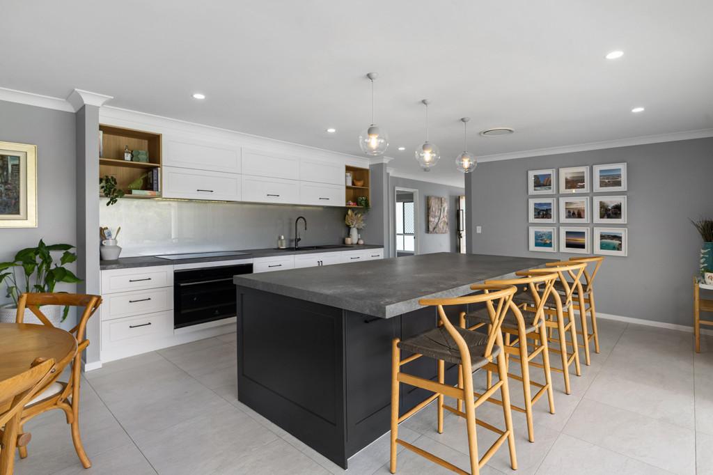 Inside, the home is finished to an exceptional standard with thoughtful design throughout. The kitchen is a true centrepiece, featuring a grand three-metre island bench with a 60mm stone benchtop, premium appliances, a fully fitted butler's pantry, soft-close cabinetry and a second dishwasher, seamlessly combining style and practicality.